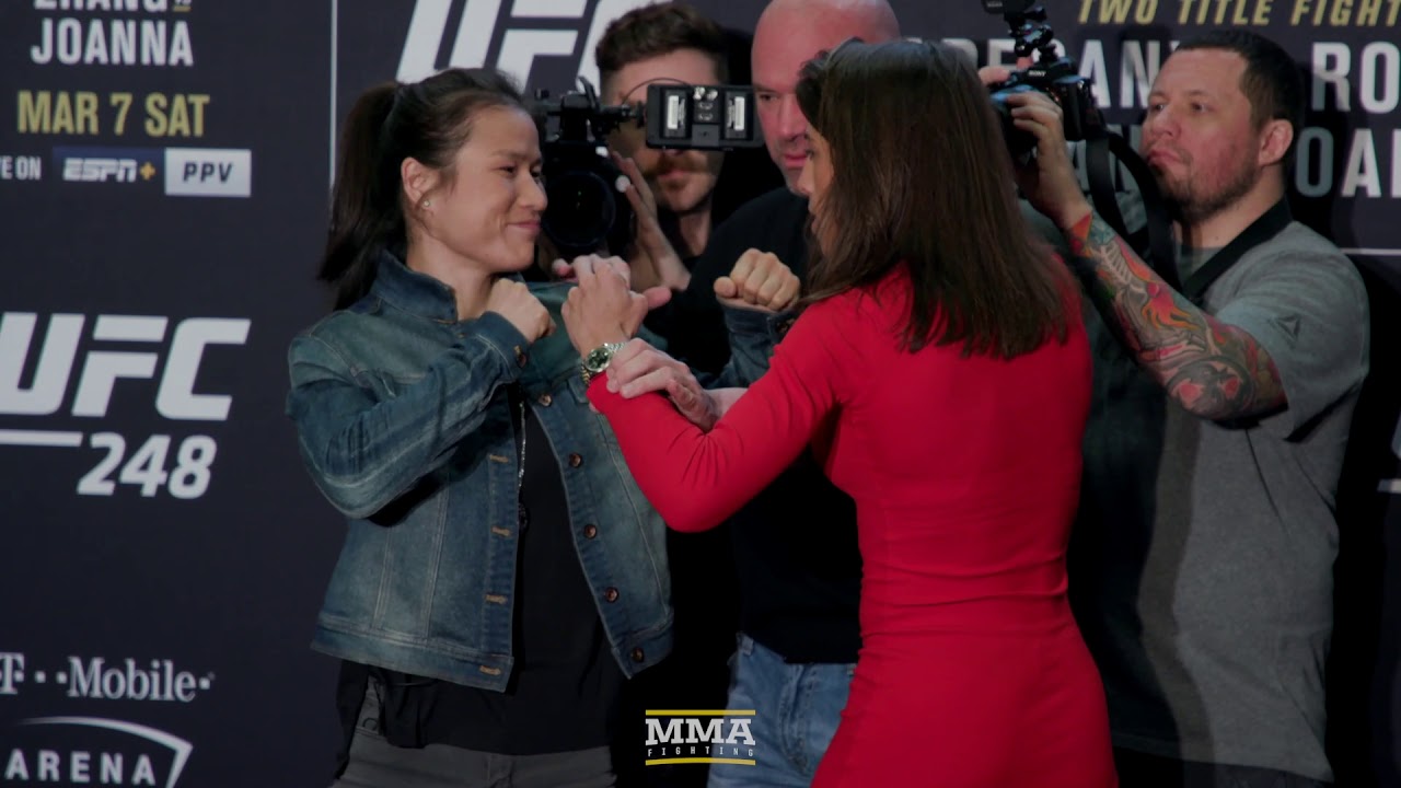 At UFC 248 media day, Zhang Weili and Joanna Jedrzejczyk squared off Thursday evening in Las Vegas.