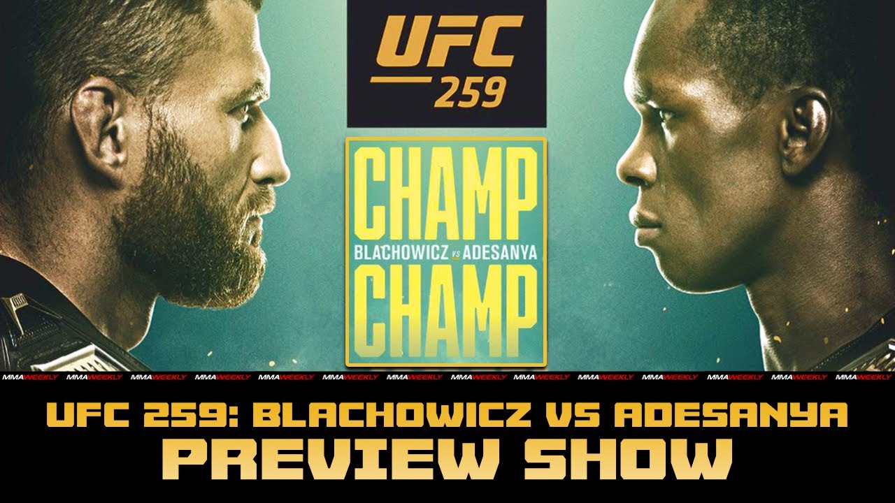 Middleweight champ Israel Adesanya challenges light heavyweight titleholder Jan Blachowicz in the UFC 259 main event. The co-main event sees Amanda Nunes put her featherweight title on the line against Megan Anderson. And bantamweight beltholder Petr Yan defends against Aljamain Sterling in a third title fight.