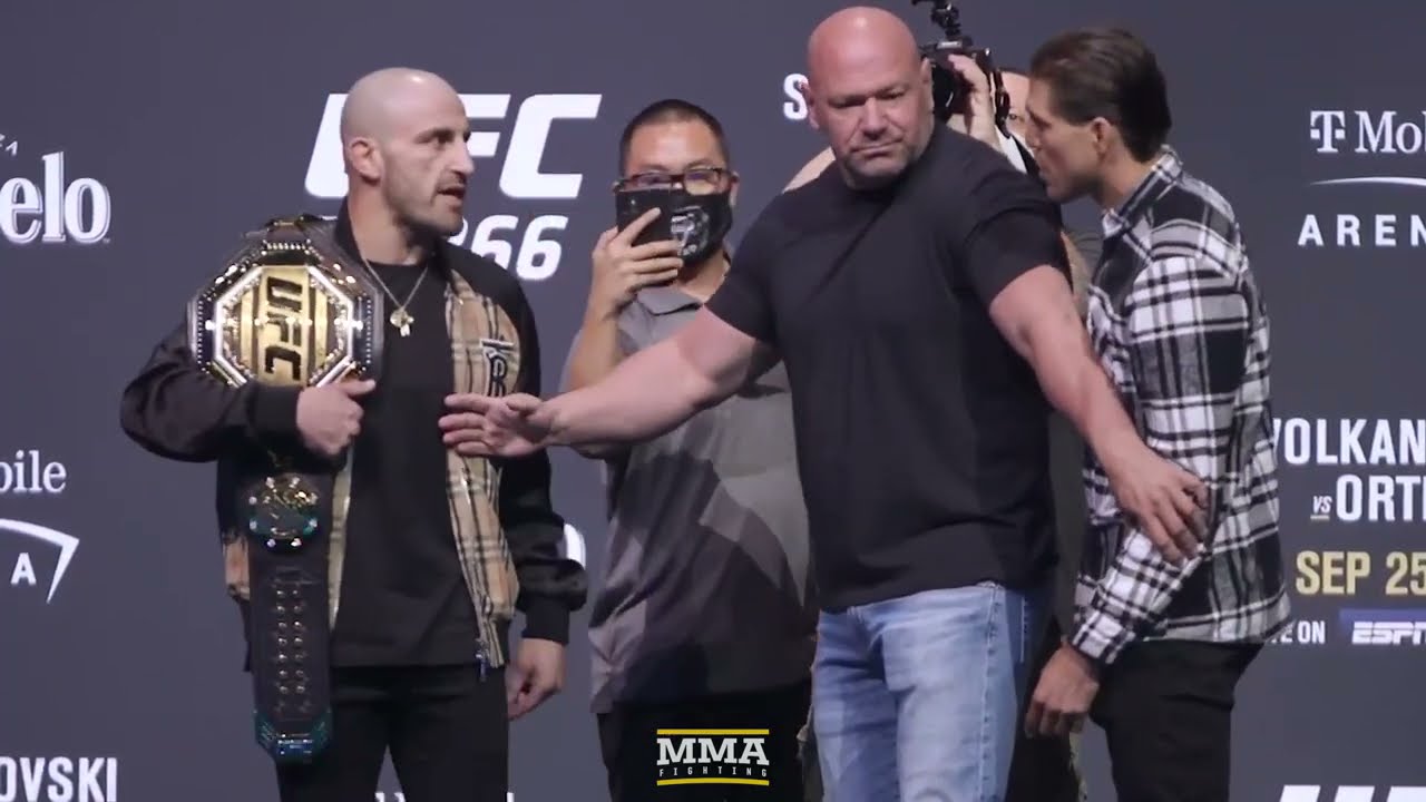 Alexander Volkanovski and Brian Ortega trade words during a tense staredown after UFC 266’s pre-fight press conference.