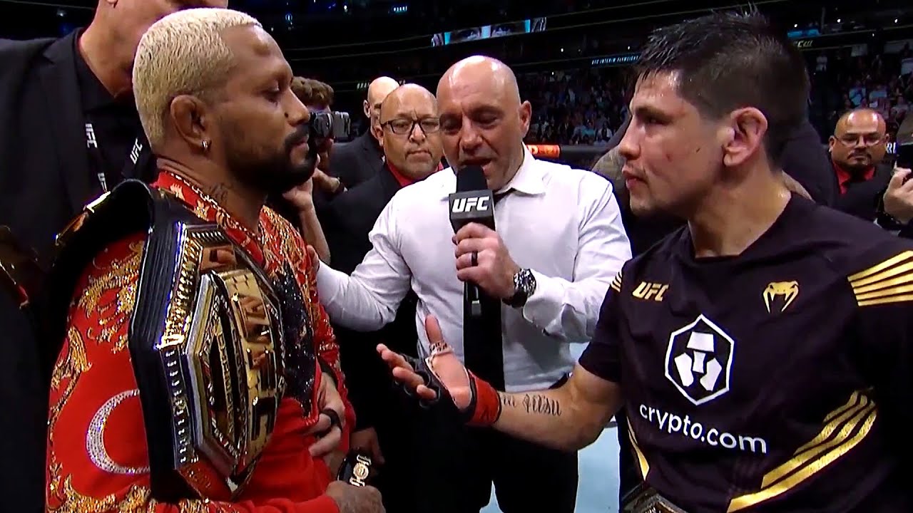 Newly crowned UFC interim flyweight champion Brandon Moreno was joined by current champ Deiveson Figueiredo and Joe Rogan in the Octagon following his third-round knockout win over Kai Kara France in the co-main event Saturday at UFC 277.