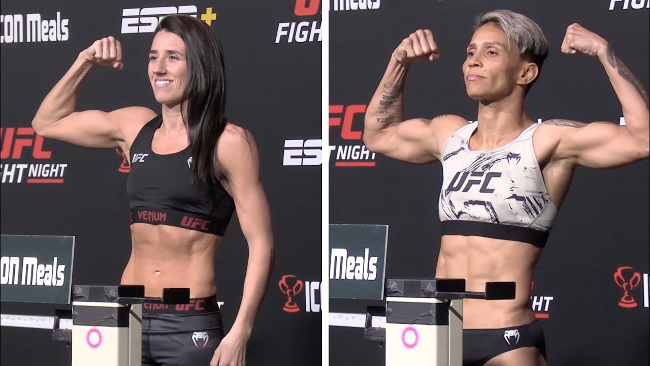 No. 3 ranked women’s straight contender Marina Rodriguez tipped the scales at 115.5 pounds while No. 7 ranked Amanda Lemos weighed in at 114.5 pounds. See how the ladies looked on the scales.